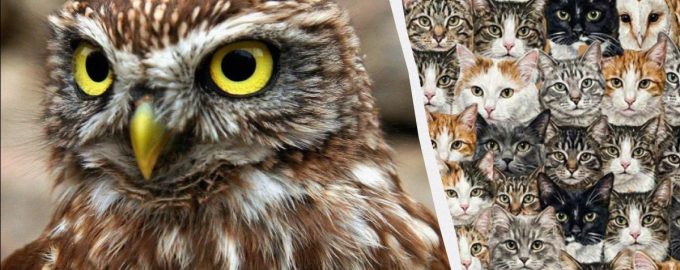 Trouver trois hiboux parmi les chats / collage Moje