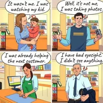 La photo ci-dessus montre qre personnes, et une seule d’entre elles ment sur son alibi. Tout d’abord, la mère avec le bébé dit qu’elle n’a pas pu prendre le portefeuille parce qu’elle « surveillait le bébé », et l’homme avec l’appareil photo prétend que ce n’était pas lui parce qu’il « prenait des photos ».