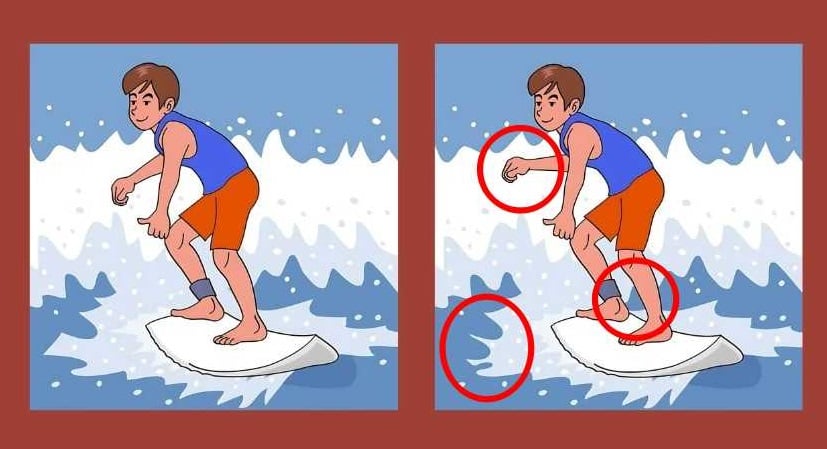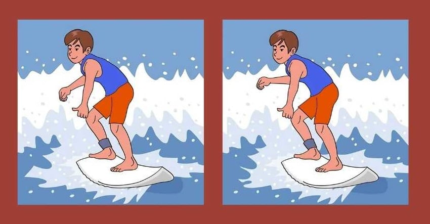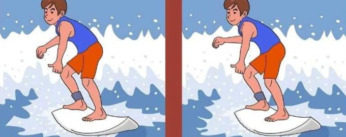 Sur la photo, nous voyons un surfeur qui conquiert les vagues sur une planche de surf. À première vue, on a l’impression que les deux personnages sont identiques, mais en y regardant de plus près, on s’aperçoit que ce n’est pas le cas – il y a quelques différences qui différencient les deux photos.